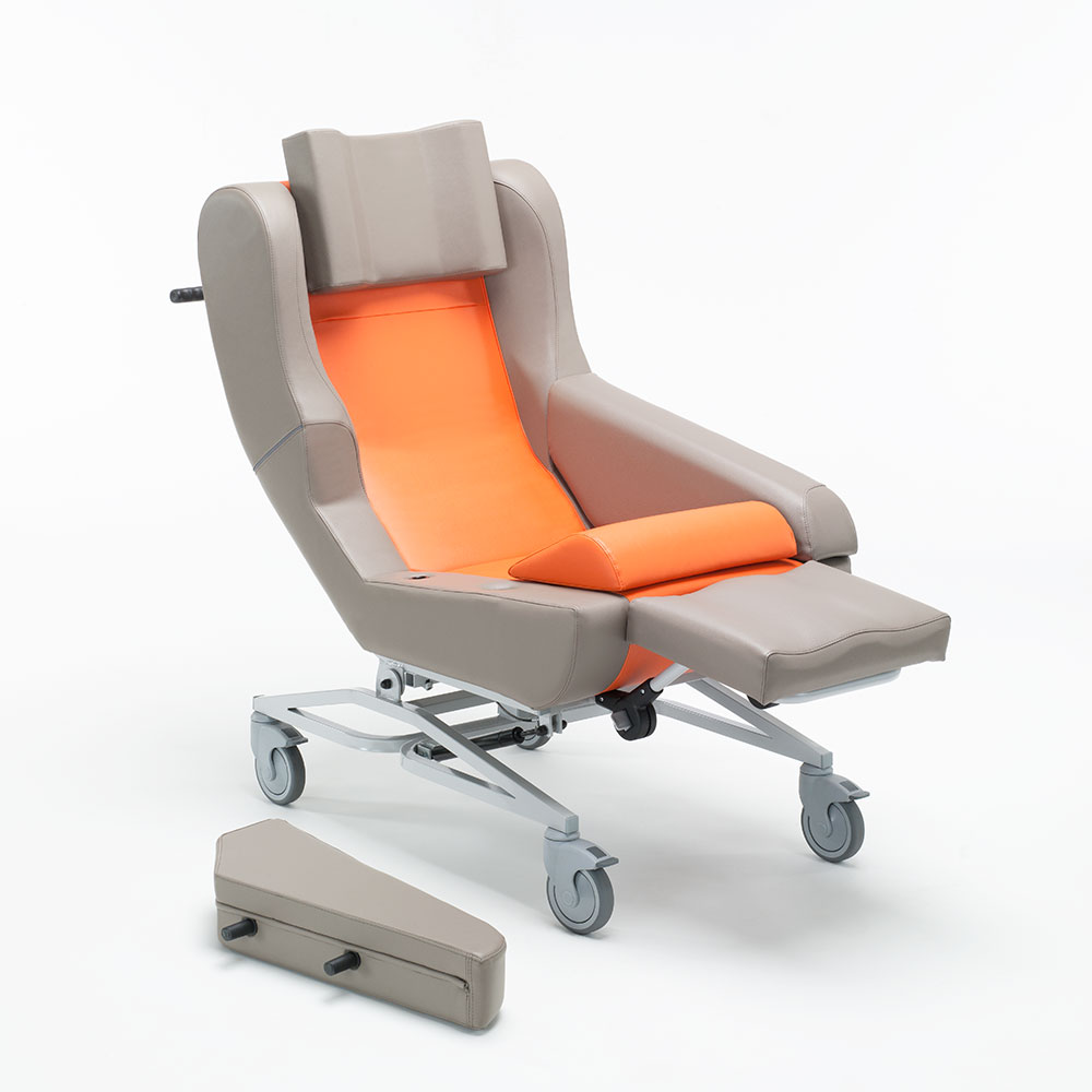 Hagen II balance transfer duo verfügt über eine abnehmbare, höhenverstellbare Kopfstütze, die eine individuelle Anpassung des Rückenbereiches ermöglicht. Der Schulterbereich ist breiter und bietet dem Benutzer mehr Freiheit. Die Fußstütze ist ergonomisch geformt und bietet somit Unterstützung und Halt für die Unterschenkel. Die angenehme konkave Form passt sich optimal dem Körper an und bietet Geborgenheit, da der Körper sich so in einer embryonalen Haltung befindet. Die beidseitig abnehmbaren Armlehnen ermöglichen einen einfachen und sicheren seitlichen Transfer des Patienten ohne Hilfe von Liftern. Dadurch wird die damit verbundene körperliche Anstrengung der Pfleger vermieden. erhältlich in der Farbe: taupe/mandarin